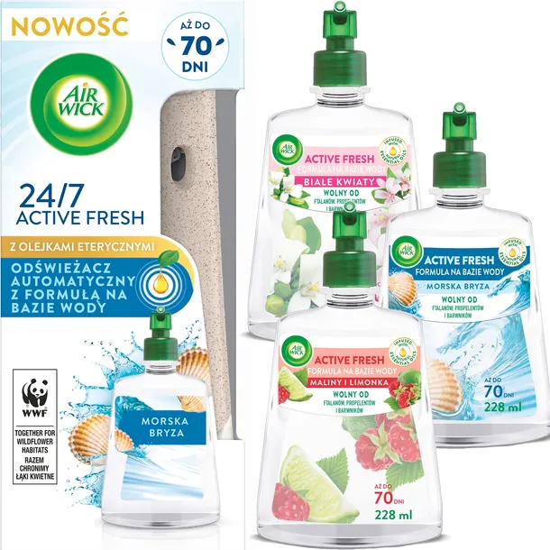 Poznaj nasz pierwszy** automatyczny odświeżacz powietrza z formułą na bazie wody, który dzięki użyciu unikalnym cząsteczkom, skutecznie neutralizuje brzydkie zapachy przez cały dzień. Air Wick 24/7 ACTIVE FRESH wypełni Twój dom zapachem aż do 70 dni*.