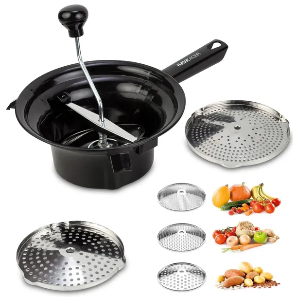 - Wyposażony w 3 sita do przecierania, z łopatką ułatwiającą przecieranie większej ilości warzyw i owoców.